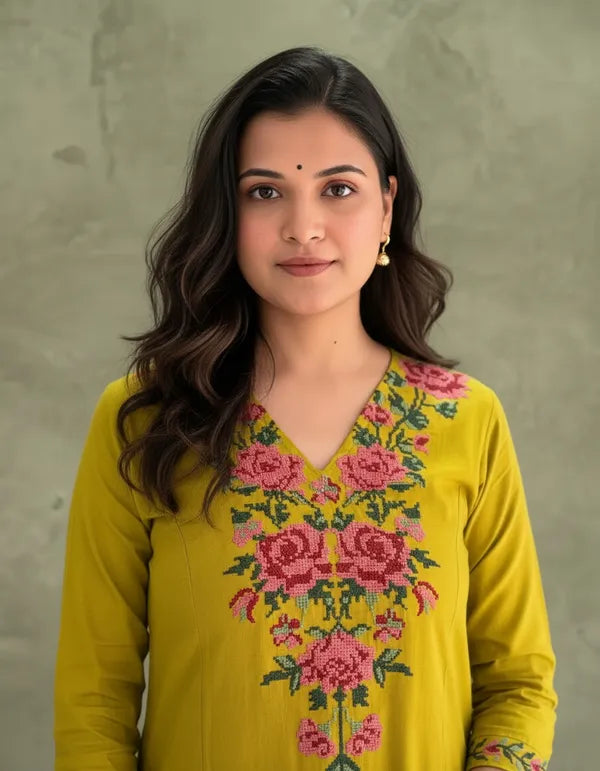 Brighten up your ethnic wardrobe with this graceful mustard yellow embroidered kurta set, designed for effortless elegance and everyday comfort. The kurta features delicate floral embroidery on the neckline, adding a touch of sophistication to its clean, minimal silhouette.